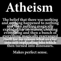 I honestly don't even have to refute the stupidity this image bears, but I will. First off, atheism is the lack of a belief in deities. Nothing more, and nothing less. The Big Bang was an explosion (or expansion if you will) of energy and matter, and in this process the protons, electrons and neutrons traveled in the rift of the expansion of time and space themselves. Our universe, which could very well be predated by others, and to the best of our knowledge, began this way.After about three-hundred eighty-five thousand years or so, everything had cooled sufficiently enough for the particles to form atoms. A lot was basic hydrogen, and the rest was helium. As these original atoms were being formed, think of hydrogen, helium, protons and the like being carried through a dark and void cosmos.